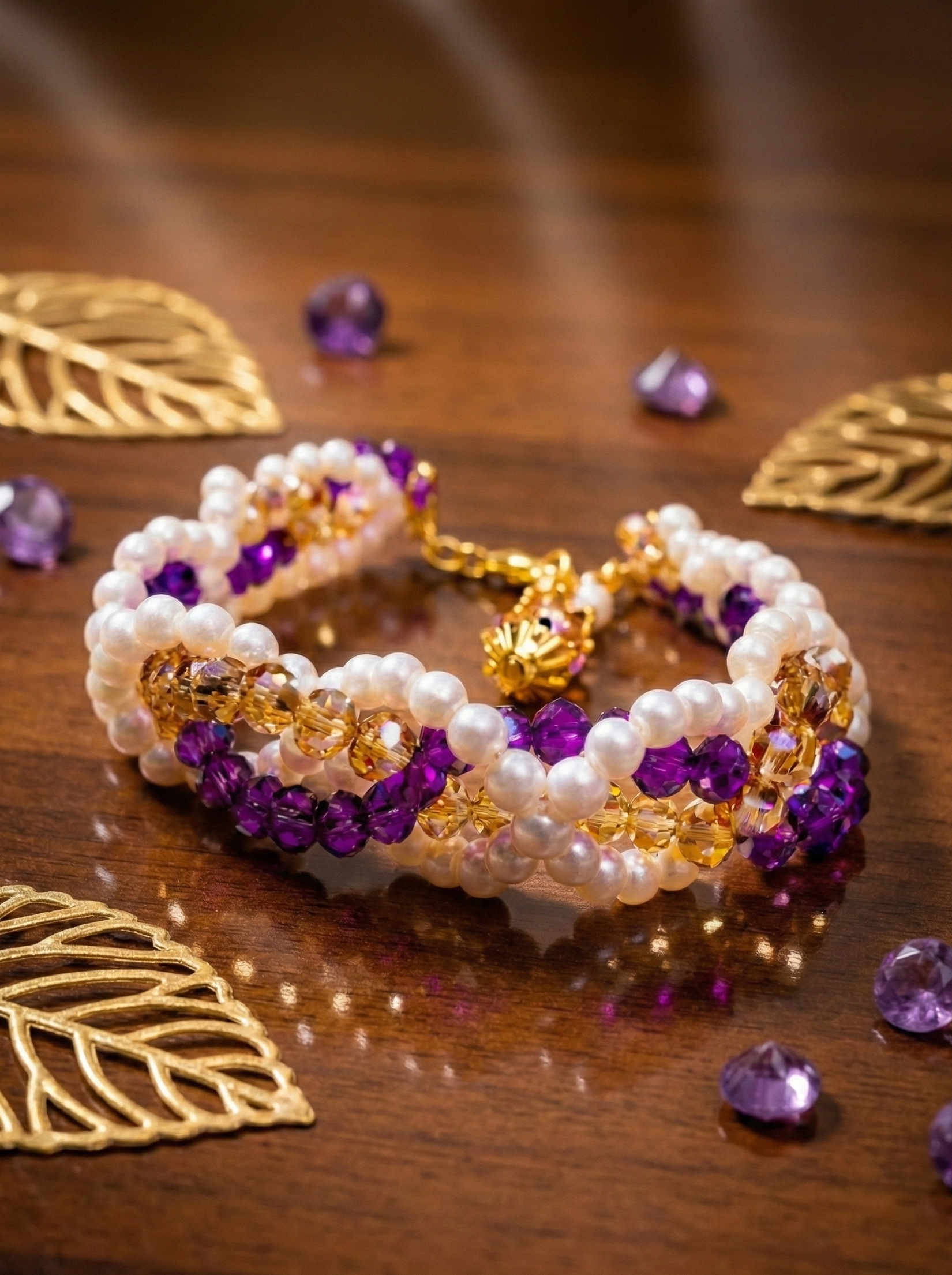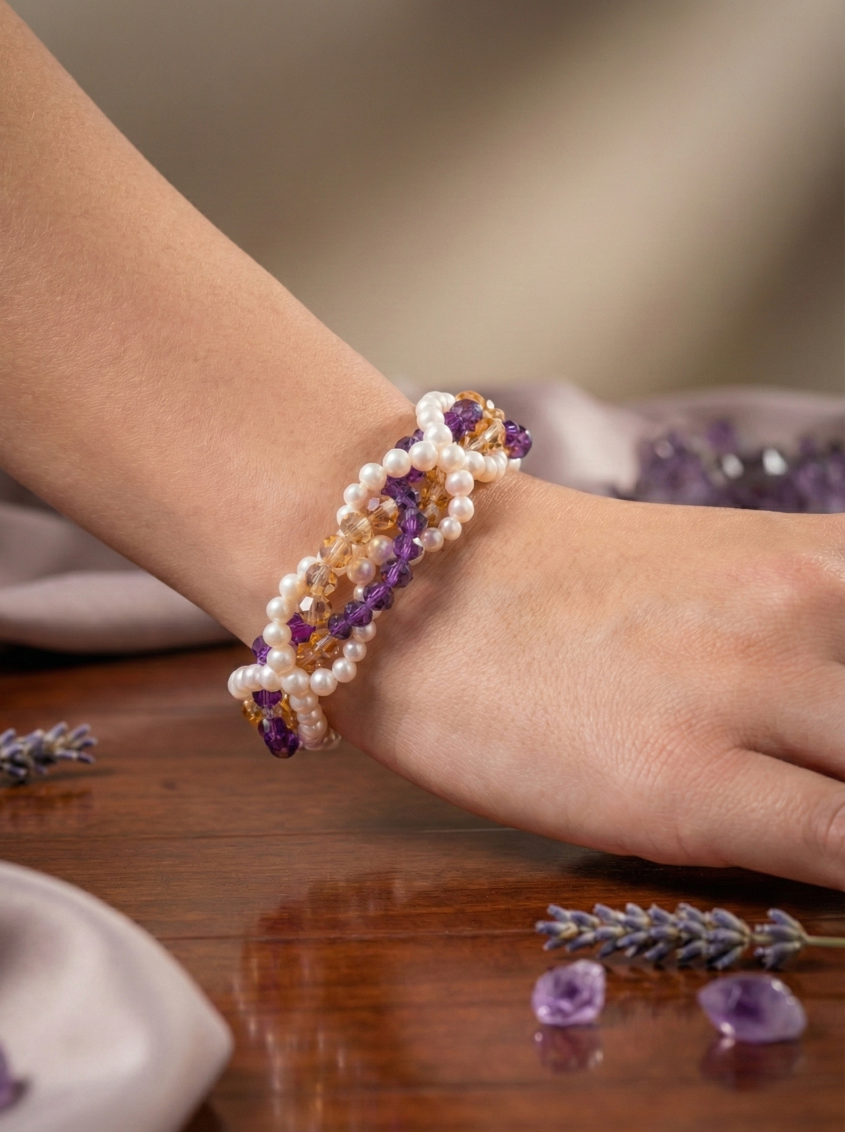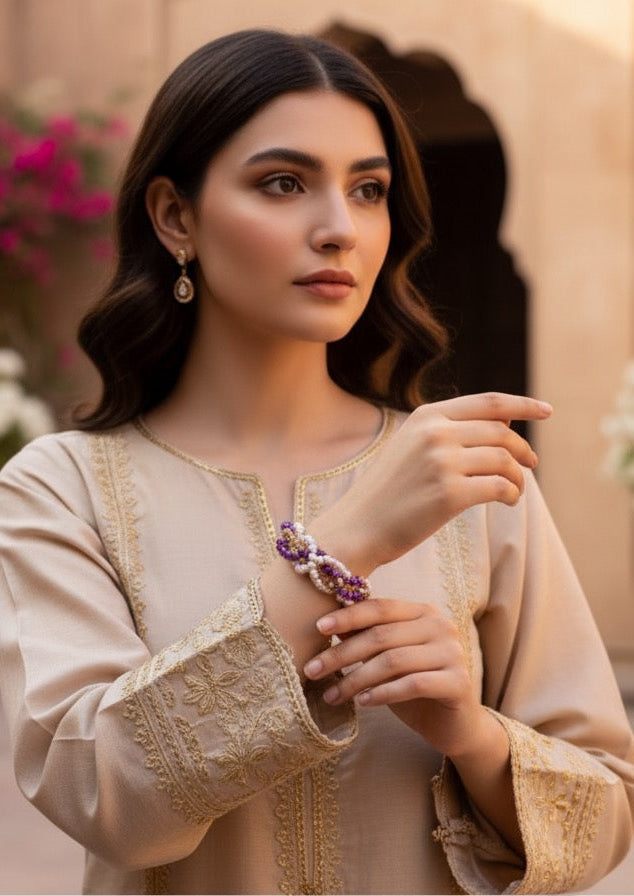 The Pearl Purple Posh bracelet is a finely crafted piece that blends the timeless elegance of pearls with a rich purple hue. Expertly handmade, it offers a sophisticated accessory that enhances any ensemble with a touch of luxury and refined style. Durable and stylish, it is perfect for both formal occasions and everyday wear.