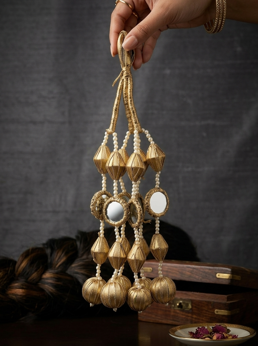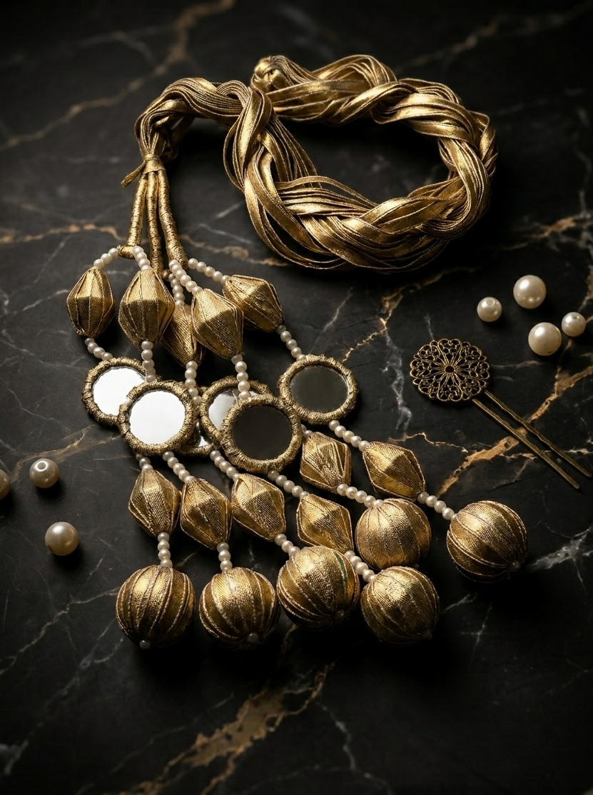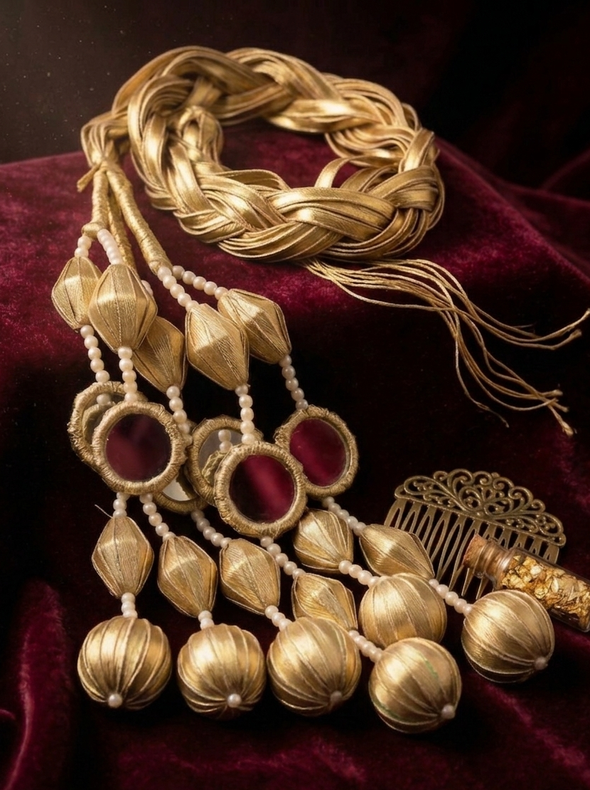 Pehnawa Handmade Premium Golden Gota Paranda by A.Jewel Elevate your traditional look with our exquisite Pehnawa paranda, meticulously crafted by hand using premium gota work. Each piece showcases intricate detailing and authentic craftsmanship that brings timeless elegance to your ensemble. Perfect for weddings, festivals, and special occasions, this handmade paranda combines traditional artistry with refined quality. The gota embellishments add a luxurious shimmer and sophistication to your hairstyle. Celebrate heritage with A.Jewel's dedication to premium handcrafted jewelry and accessories.