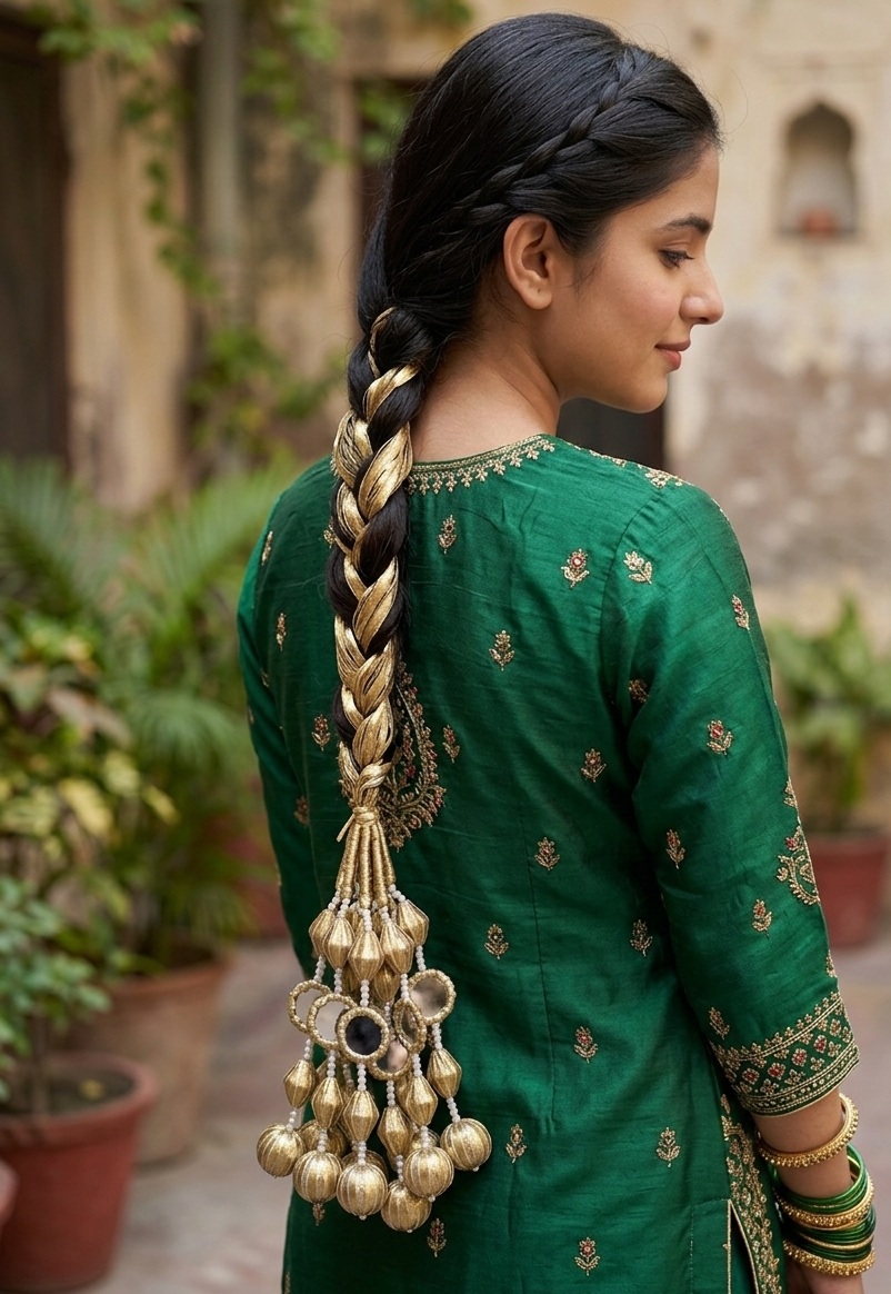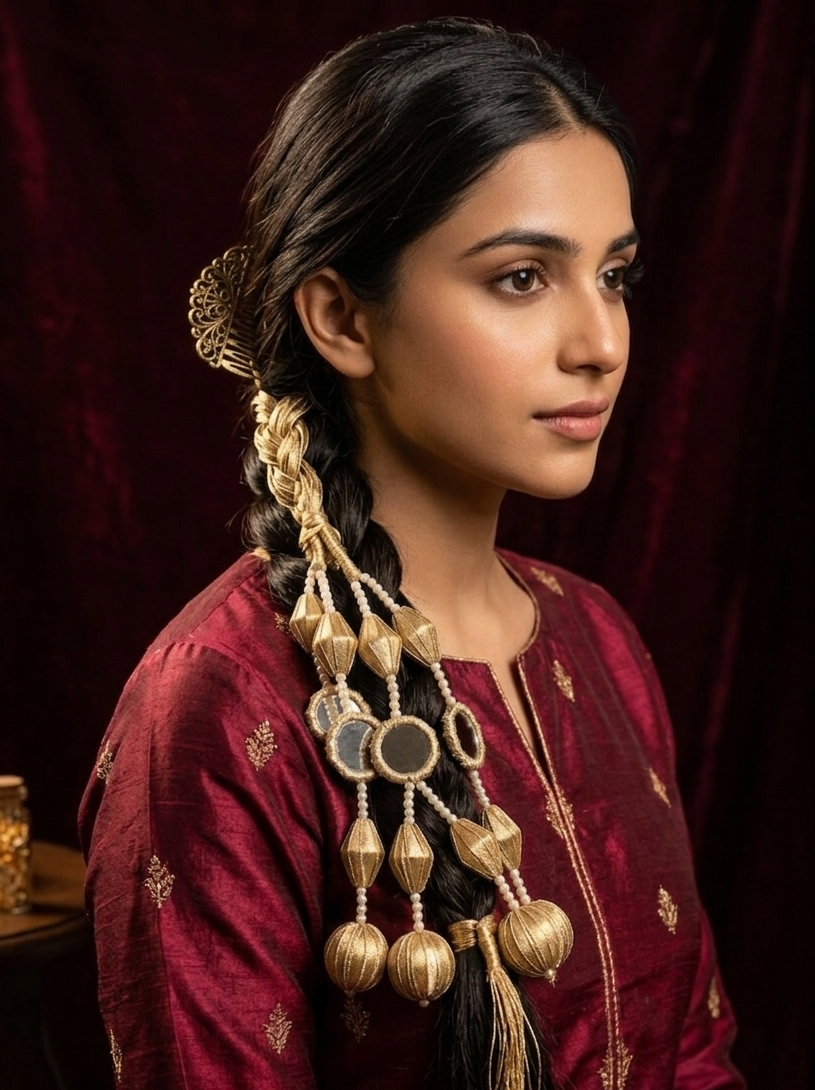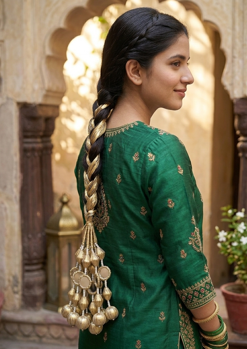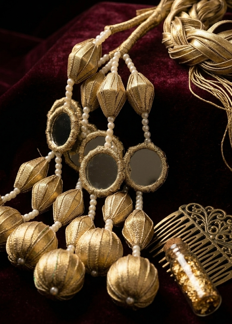 Pehnawa Handmade Premium Golden Gota Paranda by A.Jewel Elevate your traditional look with our exquisite Pehnawa paranda, meticulously crafted by hand using premium gota work. Each piece showcases intricate detailing and authentic craftsmanship that brings timeless elegance to your ensemble. Perfect for weddings, festivals, and special occasions, this handmade paranda combines traditional artistry with refined quality. The gota embellishments add a luxurious shimmer and sophistication to your hairstyle. Celebrate heritage with A.Jewel's dedication to premium handcrafted jewelry and accessories.