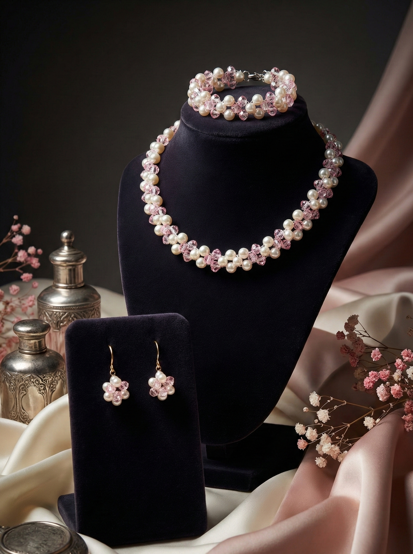 The Pink Petal Rose jewellery set includes a beautifully crafted necklace, bracelet and matching earrings, designed to evoke the elegance of delicate rose petals in soft pink tones. Expertly fashioned for a harmonious and refined look, this set adds a touch of sophistication to any outfit, making it ideal for both formal events and everyday wear. Its intricate detailing and balanced design ensure a graceful accent that enhances your natural beauty.