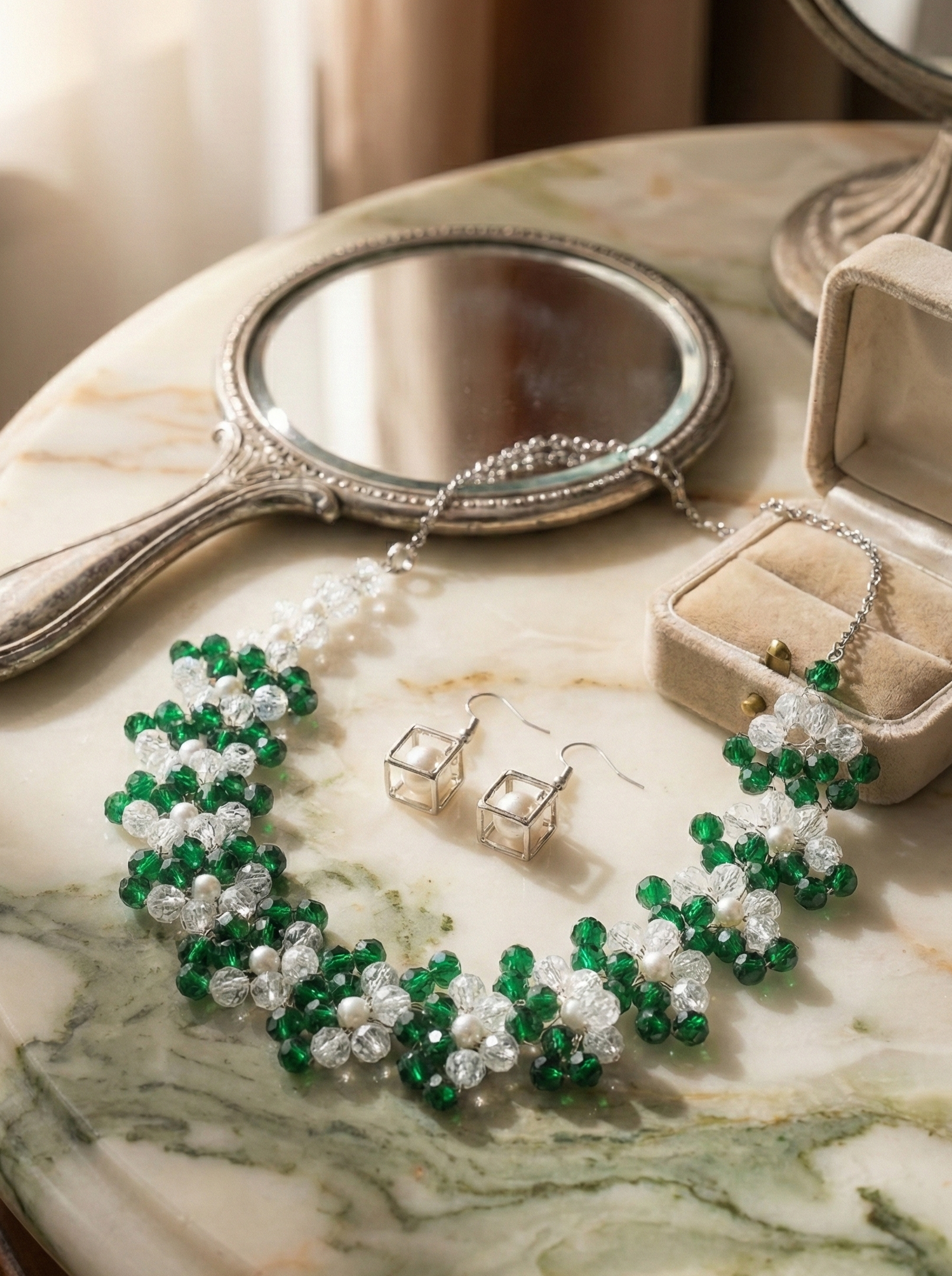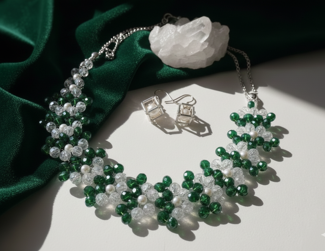 The Shabnam E Sabz jewelry set features an elegant necklace paired with matching earrings, designed to enhance any ensemble with a touch of sophistication. Meticulously crafted, this set balances classic style and refined detailing, making it ideal for both special occasions and everyday wear. Its timeless design ensures versatility, allowing you to effortlessly elevate your look.
