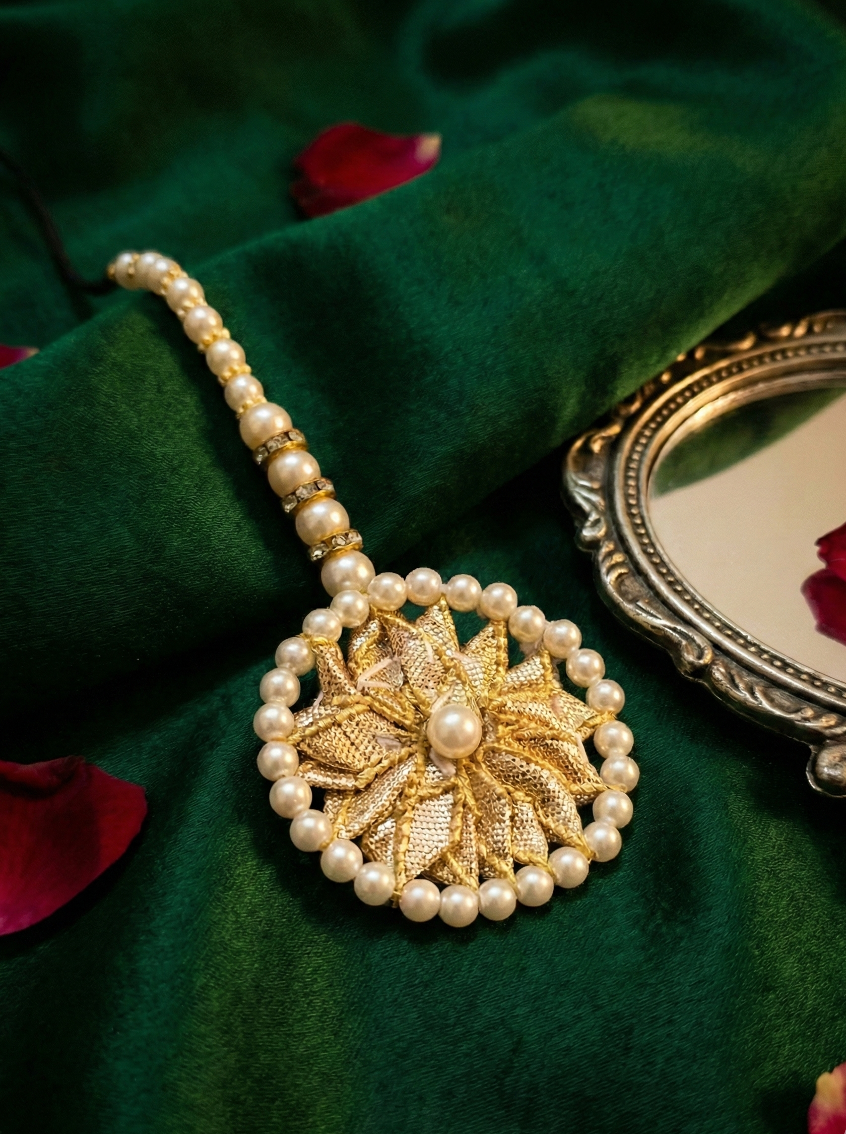 Talaai Gul bindiya showcases exquisite craftsmanship in Gota jewelry, blending traditional elegance with contemporary style. Each piece is meticulously designed using fine Gota work, known for its delicate gold or silver thread embellishments that add a rich texture and shine. Perfect for both festive occasions and daily wear, this collection enhances your ensemble with a touch of timeless sophistication and cultural heritage. Ideal for those who appreciate artisan quality and refined detailing.