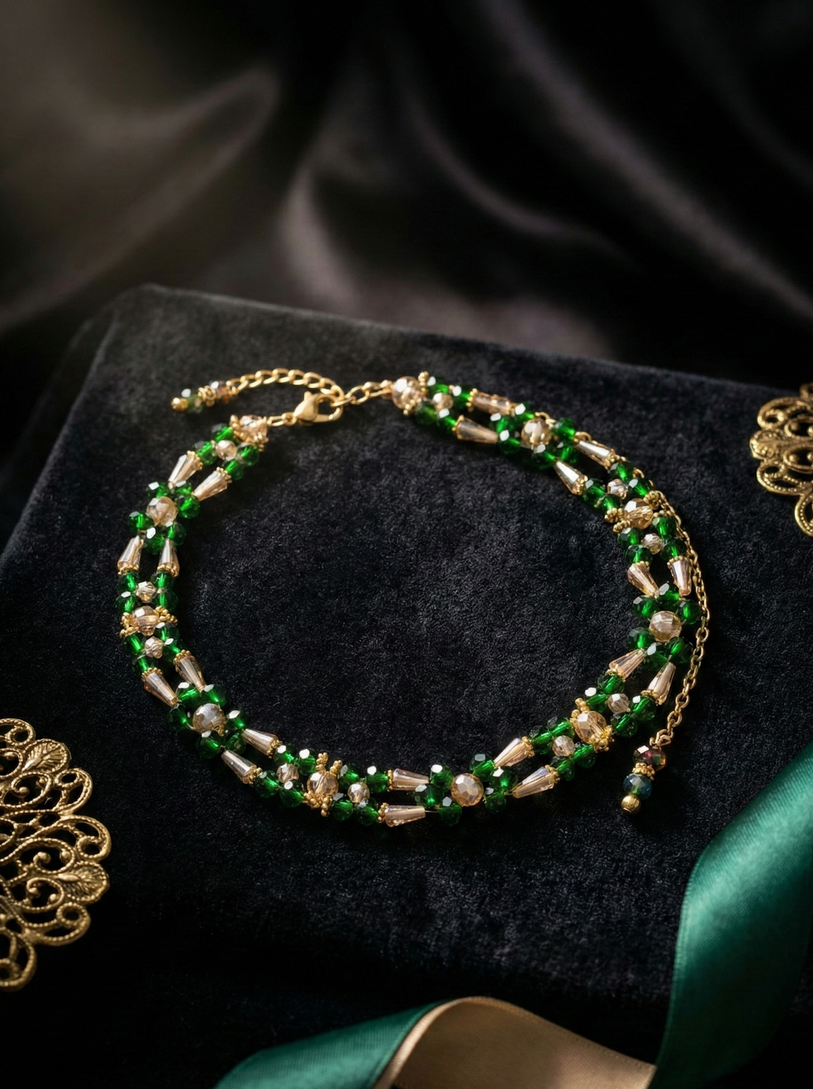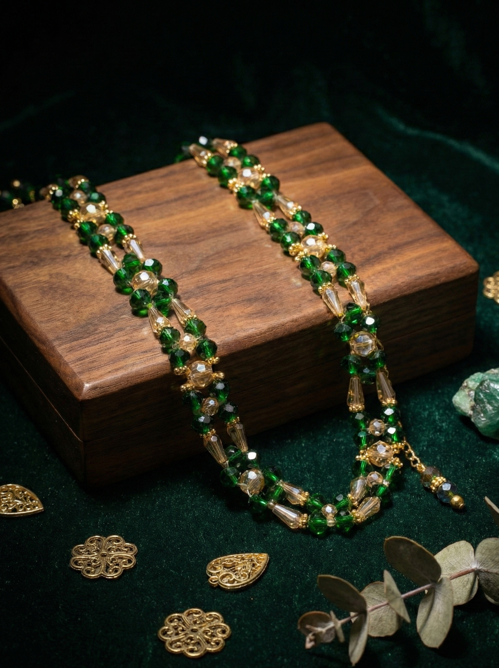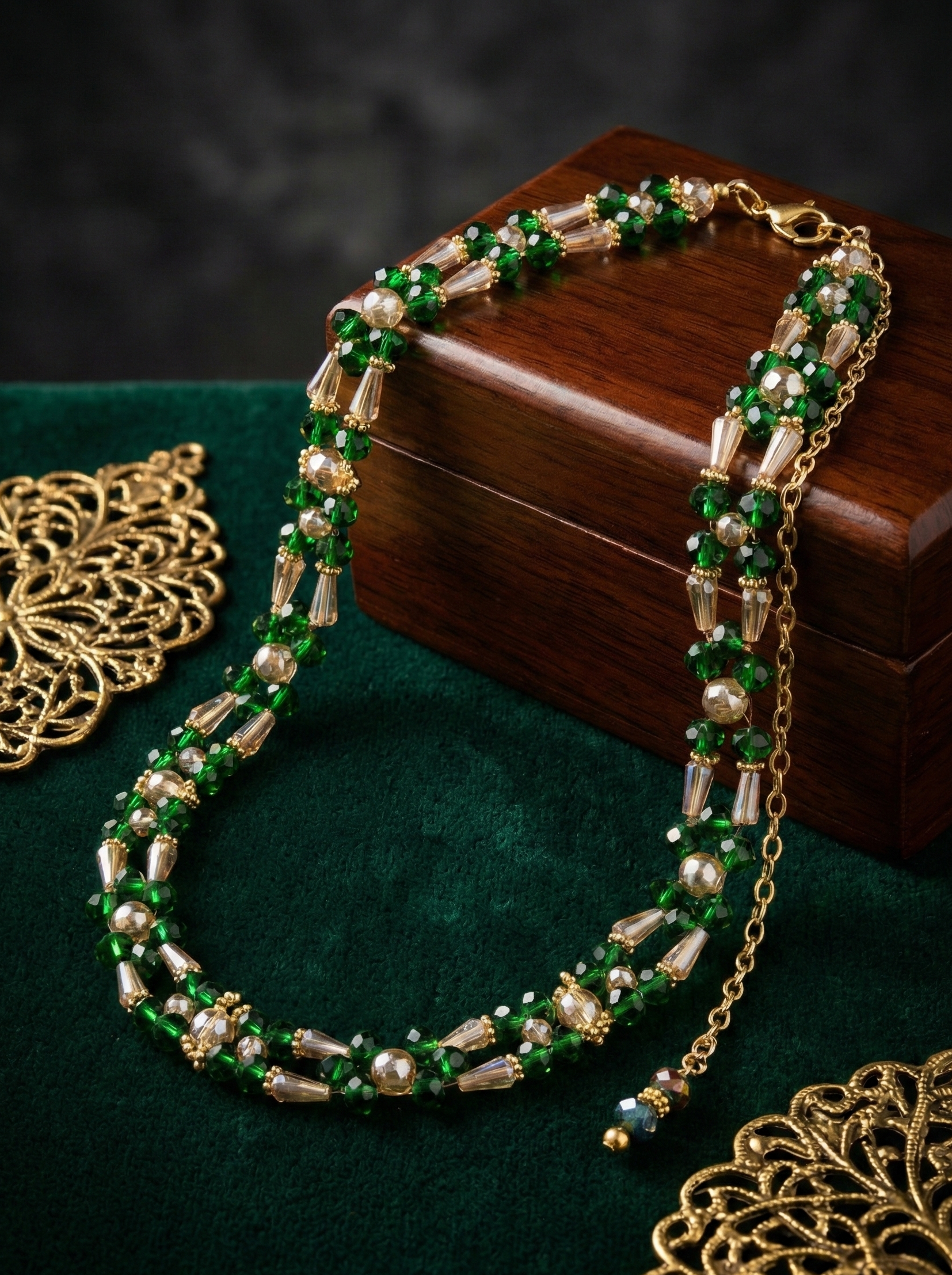 Zamrud necklace features expert craftsmanship highlighted by its striking emerald-inspired design. Meticulously crafted with high-quality materials, it offers a sophisticated balance of color and elegance. This piece is perfect for enhancing formal attire or adding a refined touch to everyday wear, reflecting a commitment to timeless style and durability.